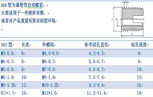 薄壁型舟山自攻螺套外观上看主要有两种区分,一种是一端开槽型的,另一种是一端三圆孔型的,其中开圆孔型的又分为307型和308型两种,307型和308型外观主要区别就是同一直径下,长度和外径大小有所区分。以上各种型式螺套均具有自行攻牙功能。